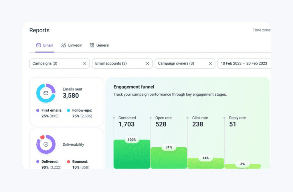 E claro: o que não se mede, não se melhora. Com o painel analítico da Snov.io, você tem visão total das estatísticas das suas campanhas no LinkedIn e pode ajustar cada etapa com base em dados reais.