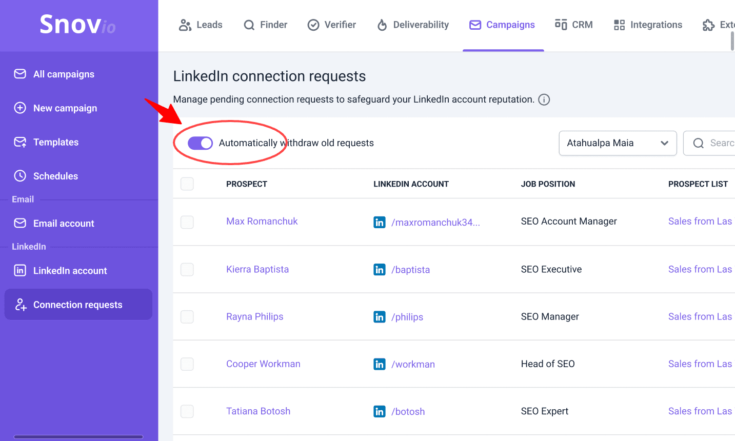 | 📌 Nota da especialista Proteja sua conta Enviar convites demais sem resposta pode trazer consequências negativas, como gerar um alerta de segurança que tornarão sua conta do LinkedIn restrita. Para evitar restrições e contornar o limite de convites semanais do LinkedIn, mantenha menos de 500 solicitações pendentes. Com a ferramenta de prospecção do LinkedIn da Snov.io, você pode retirar convites antigos automaticamente e manter um alcance seguro e eficaz. |