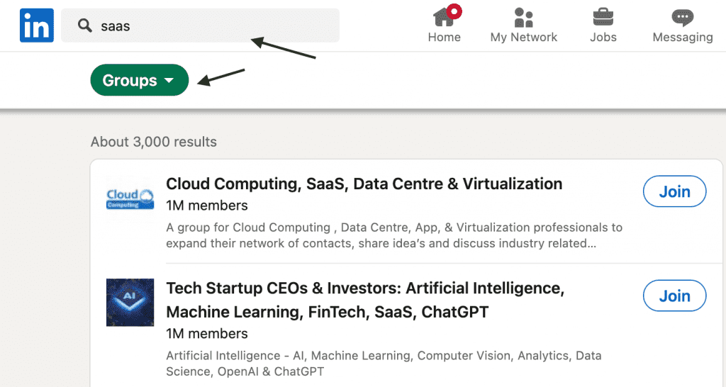 Às vezes, você e seu lead já fazem parte do mesmo grupo, mas se não, basta dar uma olhada no perfil dele. Os grupos podem ser uma ótima porta de entrada para novas oportunidades de prospecção. Use a barra de pesquisa do LinkedIn para digitar uma palavra-chave relacionada à sua área e filtre os resultados por “Grupos”.