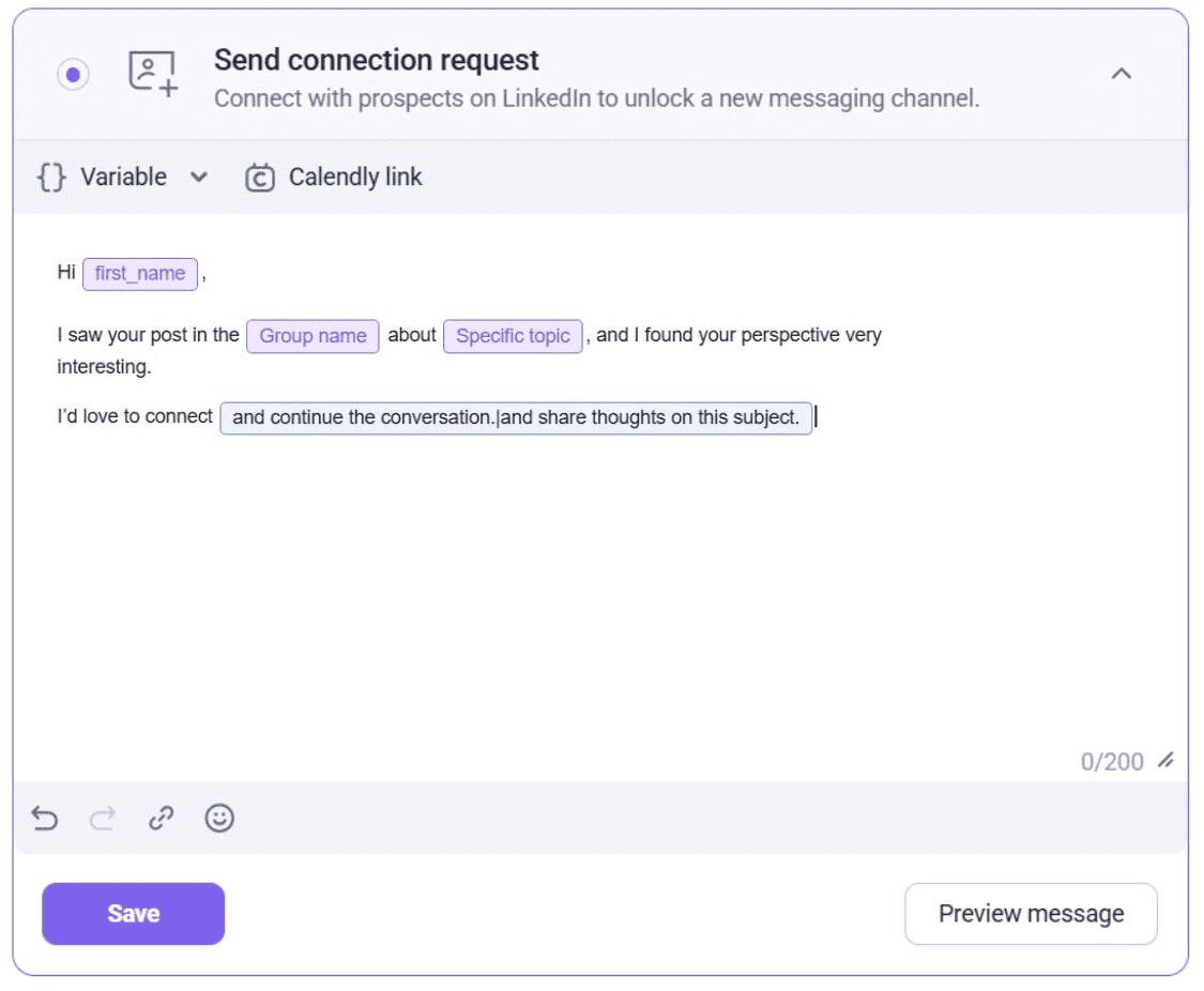 👀 Você sabia? A Snov.io oferece recursos avançados de personalização que permitem que você adapte suas solicitações de conexão, mensagens e InMails em grande escala. Isso pode ser útil se você deseja entrar em contato com membros de grupos do LinkedIn. Caso esse seja seu objetivo, recomendamos adicionar as seguintes opções de personalização de texto em suas mensagens:
