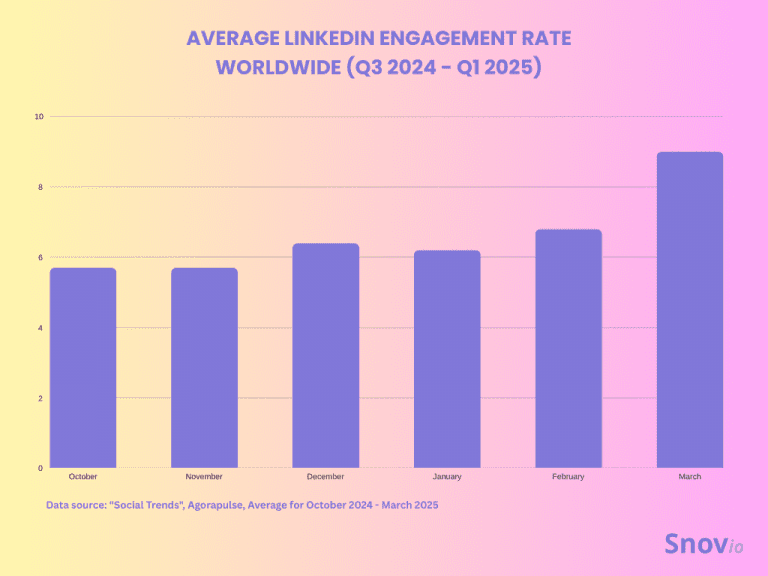 Não existe uma referência fixa para o que seria considerado uma boa taxa de engajamento em tal plataforma, pois isso depende do seu setor e público-alvo. Segundo o Social Trends da Agorapulse, a taxa média mundial de engajamento no LinkedIn em todos os setores era, em 2024, de 5,2%. Porém, no primeiro trimestre de 2025, esse valor cresceu para 7,3%.