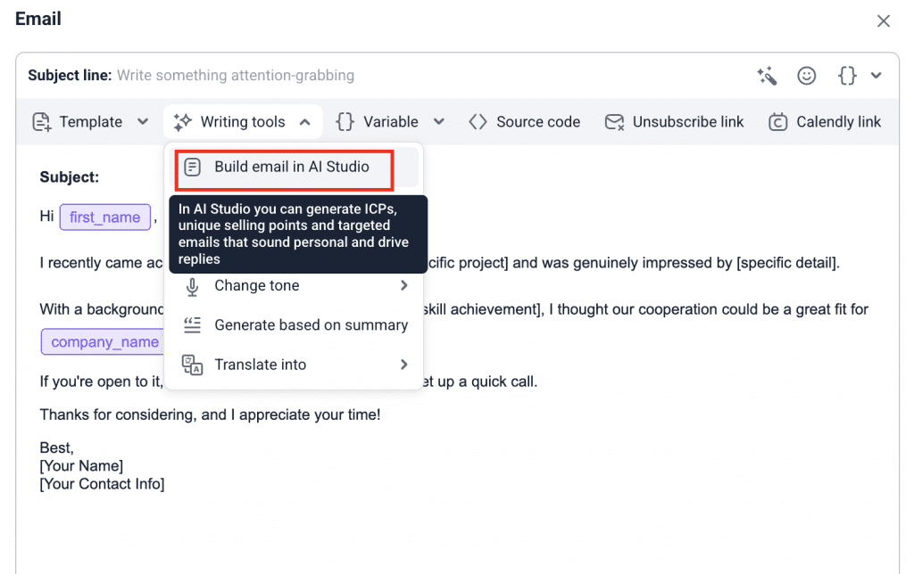 Enquanto isso, com nosso IA Studio, você ainda pode criar mensagens segmentadas com base no seu ICP e em seus argumentos de venda exclusivos.