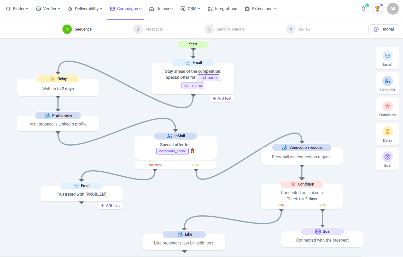 💡 Dica de especialista Combine vários canais de comunicação para aumentar suas chances de obter uma resposta. Você pode, por exemplo, mandar uma mensagem personalizada para seu lead se apresentando e, em seguida, enviar uma solicitação de conexão para essa pessoa no LinkedIn. Se quiser tornar esse processo ainda mais fácil, considere experimentar os recursos da Snov.io para colocar seu alcance multicanal no piloto automático. Crie sequências multicanal automatizadas ao adicionar ações do LinkedIn às suas campanhas de e-mail. Diminua suas dores de cabeça, incluindo solicitações de conexão, visualizações de perfil, curtidas em publicações, seguidores, mensagens e até mesmo InMails personalizados. |