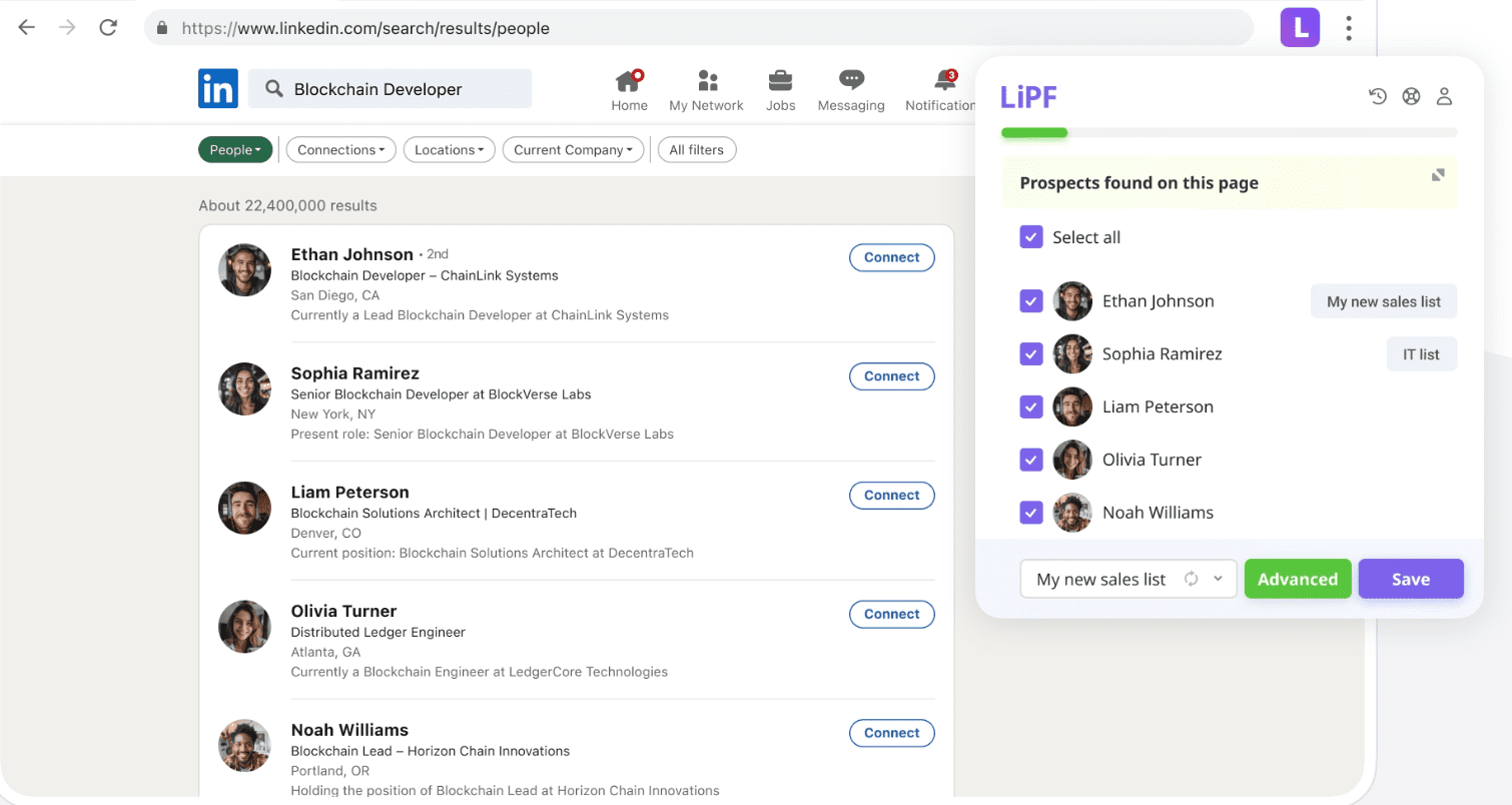 Captura de tela da pesquisa do LinkedIn por 'Blockchain Developer' (cerca de 22,4 milhões de resultados) com a extensão LI Prospect Finder aberta na lateral, listando e selecionando 5 prospectos como 'Ethan Johnson' e 'Sophia Ramirez', prontos para serem salvos.