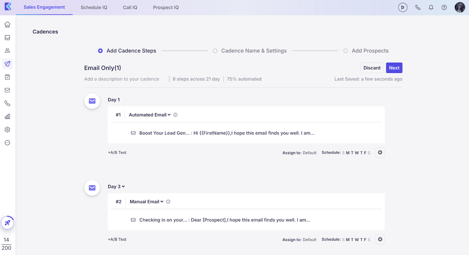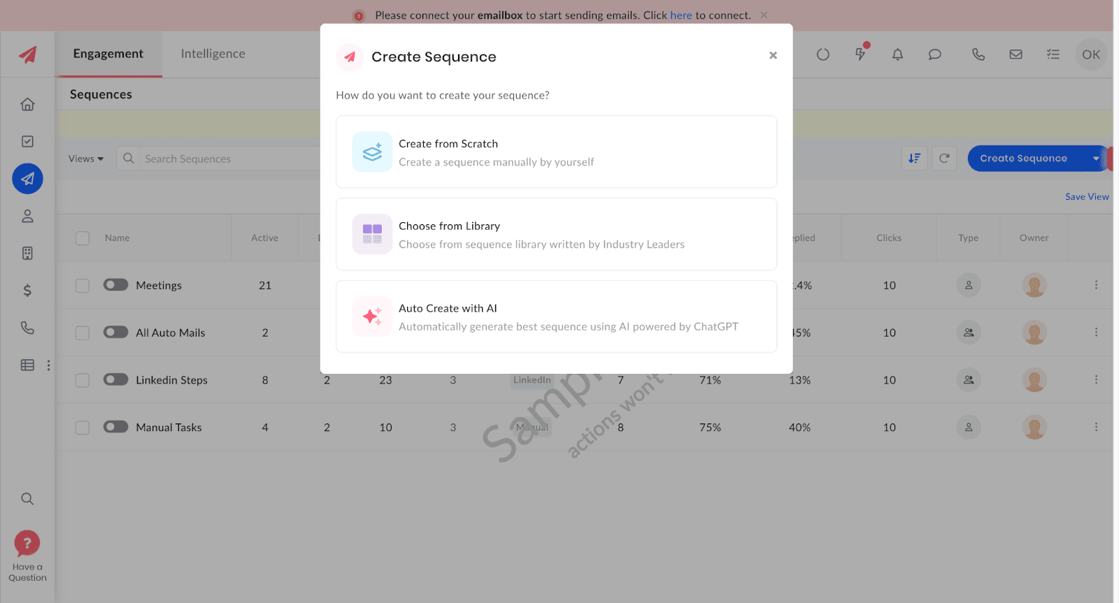 - Sequências multicanal: crie campanhas em vários canais usando IA para personalizar e-mails, chamadas, SMS, interações no LinkedIn e tarefas.