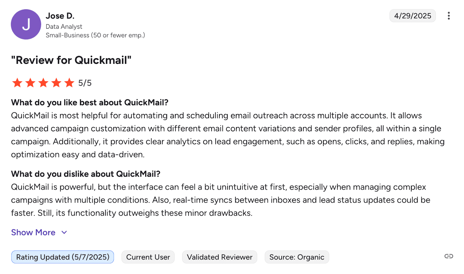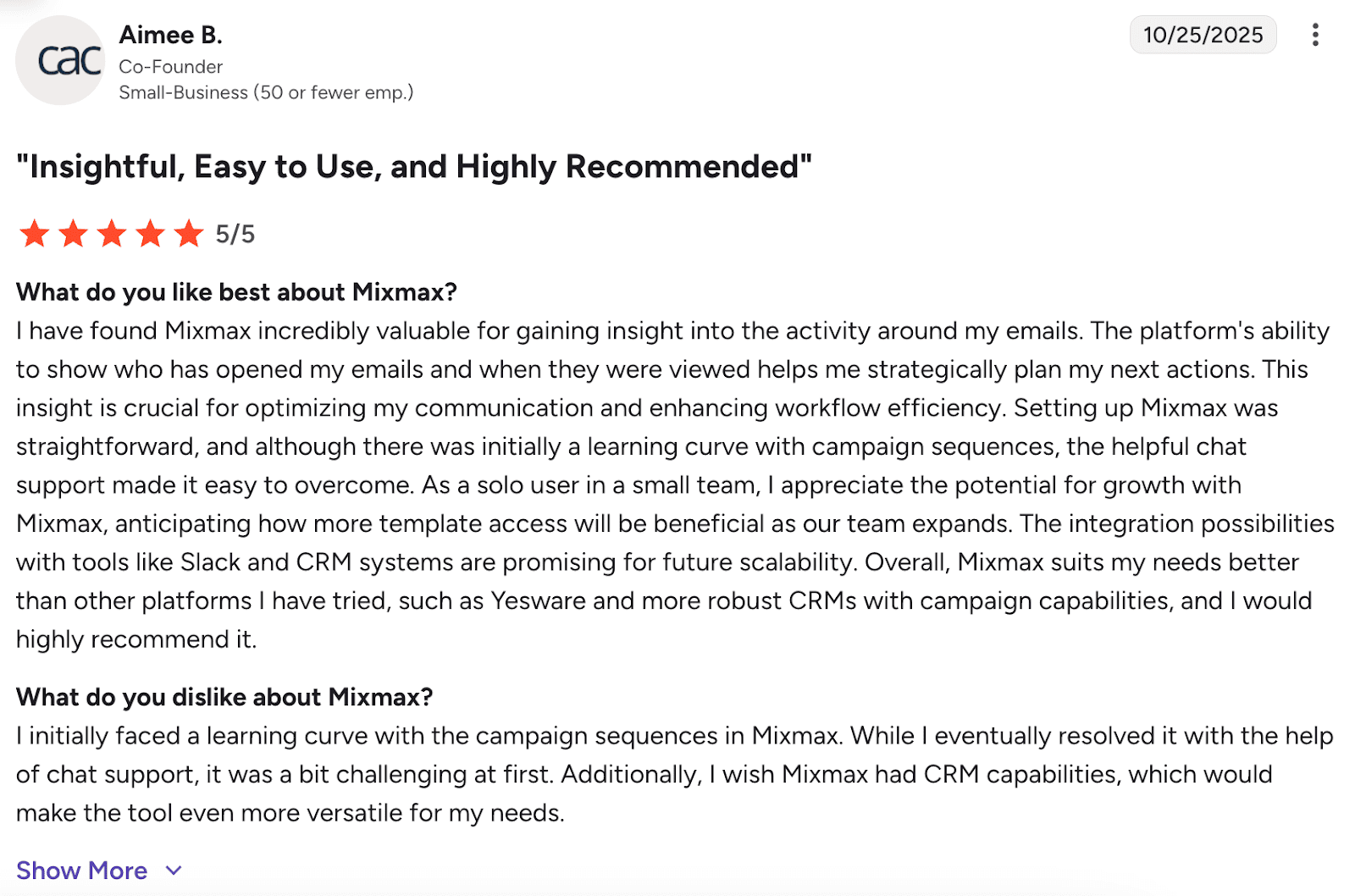 O Mixmax se destaca por seu poderoso rastreamento de e-mails e modelos que economizam tempo. Os usuários também adoram sua interface amigável que requer treinamento mínimo, além do seu suporte ao cliente ágil. No entanto, a plataforma apresenta algumas funcionalidades ausentes e problemas ocasionais de integração com CRMs.