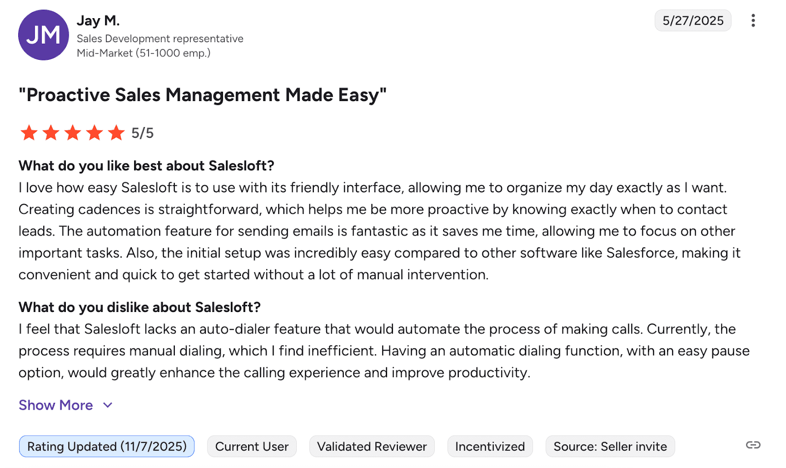 - Salesloft – apresenta recursos de prospecção multicanal e integrações de CRM em um só lugar.