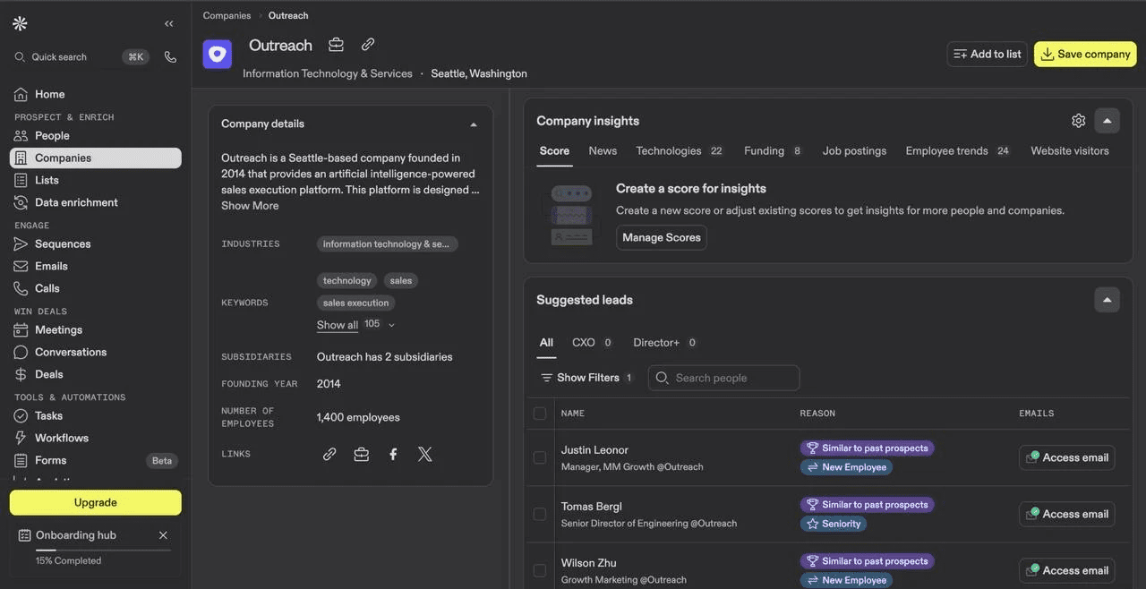 - Outreach – solução de nível empresarial com automação e análises avançadas em vários canais de prospecção.