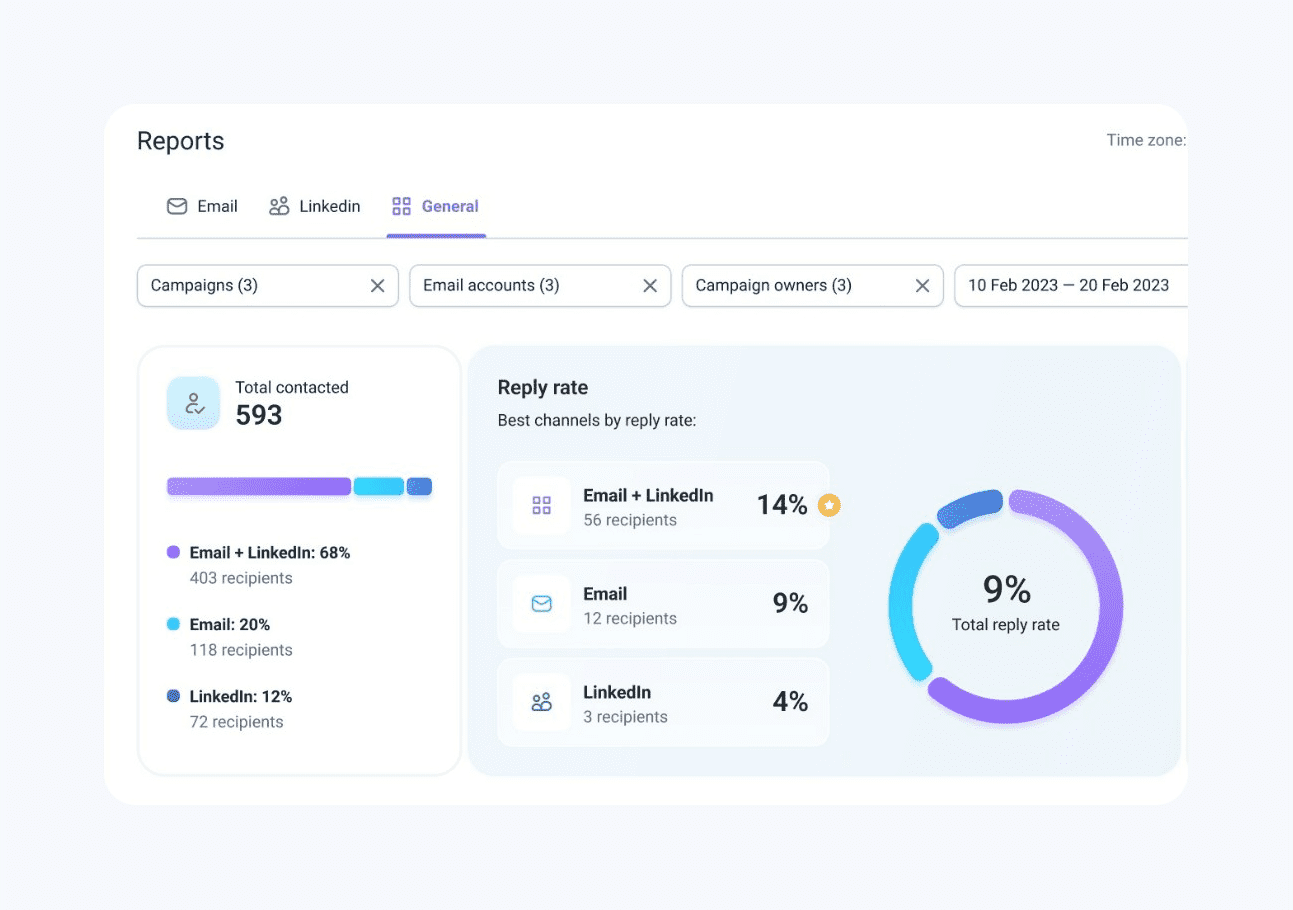 Como você não pode melhorar o que não mede, as melhores ferramentas de e-mail frio oferecem relatórios detalhados sobre diversas métricas. Equipes maiores precisam de relatórios mais sofisticados para acompanhar várias campanhas diferentes simultaneamente.