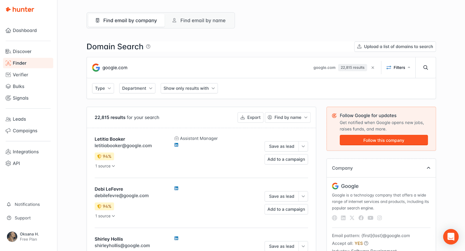 - Busca por domínio: encontre endereços de e-mail profissionais e detalhes de empresas associados a qualquer domínio para identificar clientes potenciais mais rapidamente.