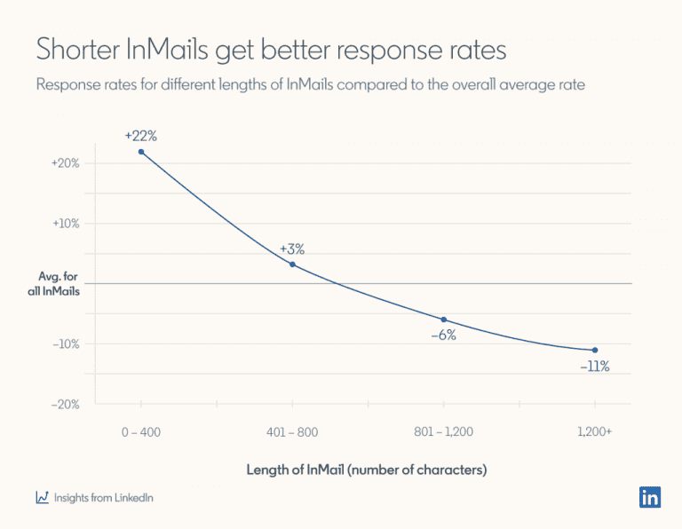 O InMail permite até 1.900 caracteres, mas isso significa que você deve usar tudo? Estudos indicam que InMails com menos de 400 caracteres geram taxas de resposta até 22% maiores do que mensagens longas.
