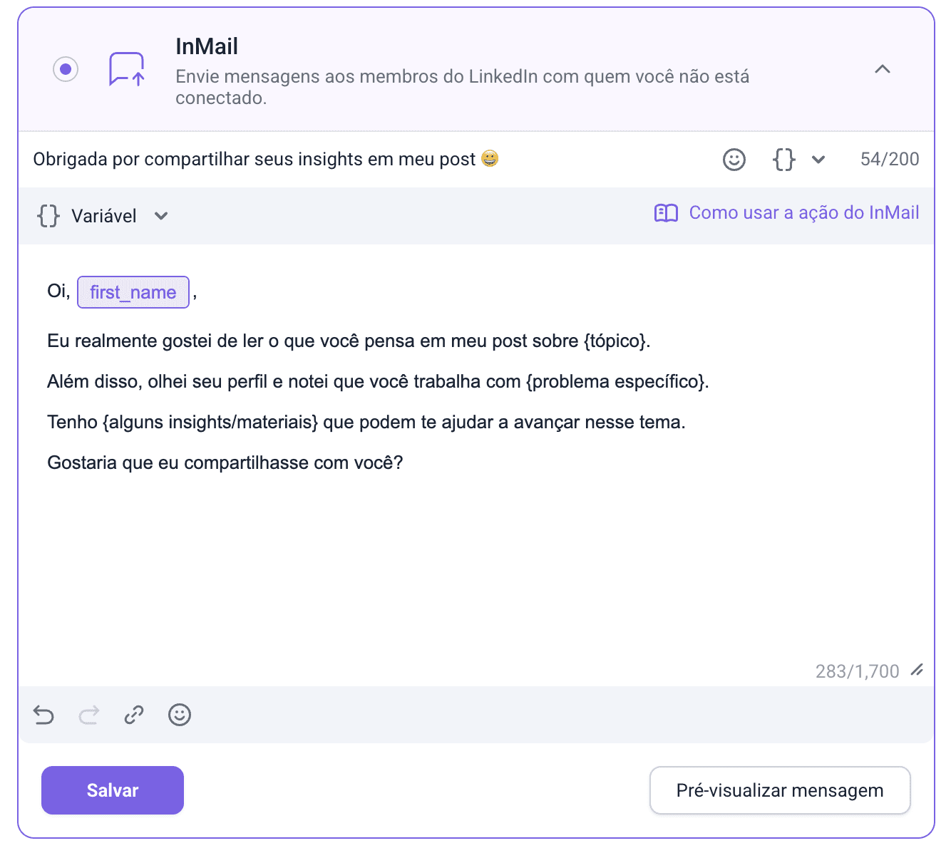 De modo geral, InMails funcionam melhor para abordagens mornas devido ao custo. Ainda assim, você pode usar este exemplo como primeira mensagem da sua campanha com InMail. Se tiver uma oferta comercial clara, utilize os modelos a seguir para LinkedIn para vendas, link building, influenciadores ou recrutamento.