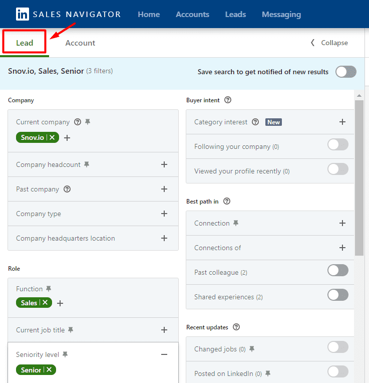 Repetir a mesma combinação de filtros várias vezes pode ser cansativo. Por isso, o Sales Navigator permite salvar configurações específicas.