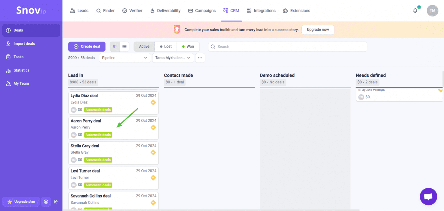 Minha recomendação é otimizar todo o fluxo usando ferramentas de automação. Essa abordagem economiza muitas horas de trabalho repetitivo e também garante mais precisão. Com a ferramenta de geração de leads do LinkedIn da Snov.io, você consegue: