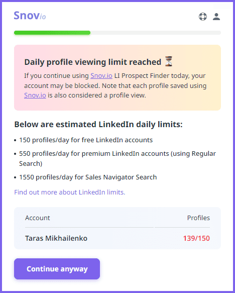 Para buscas volumosas, use ferramentas que respeitem os limites do LinkedIn. Com o Localizador de e-mails do LinkedIn da Snov.io, você pode definir limites seguros para o processo parar automaticamente ao atingir o limite estabelecido