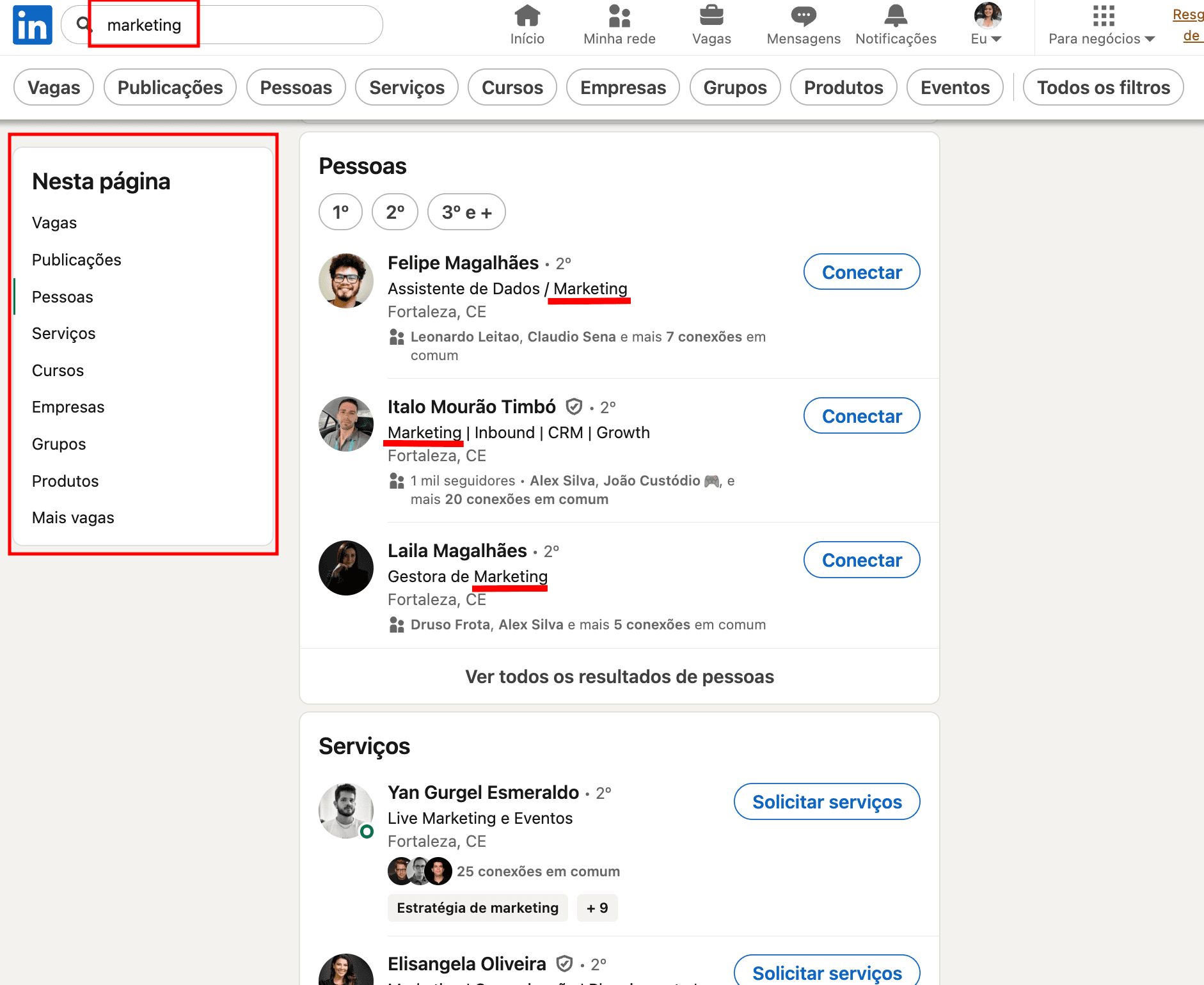 A consulta pode ser qualquer palavra ou expressão. Por exemplo, se você quer vender um aplicativo de gerenciamento de campanhas, pode buscar profissionais ligados à área da comunicação. Basta digitar “marketing” na barra.
