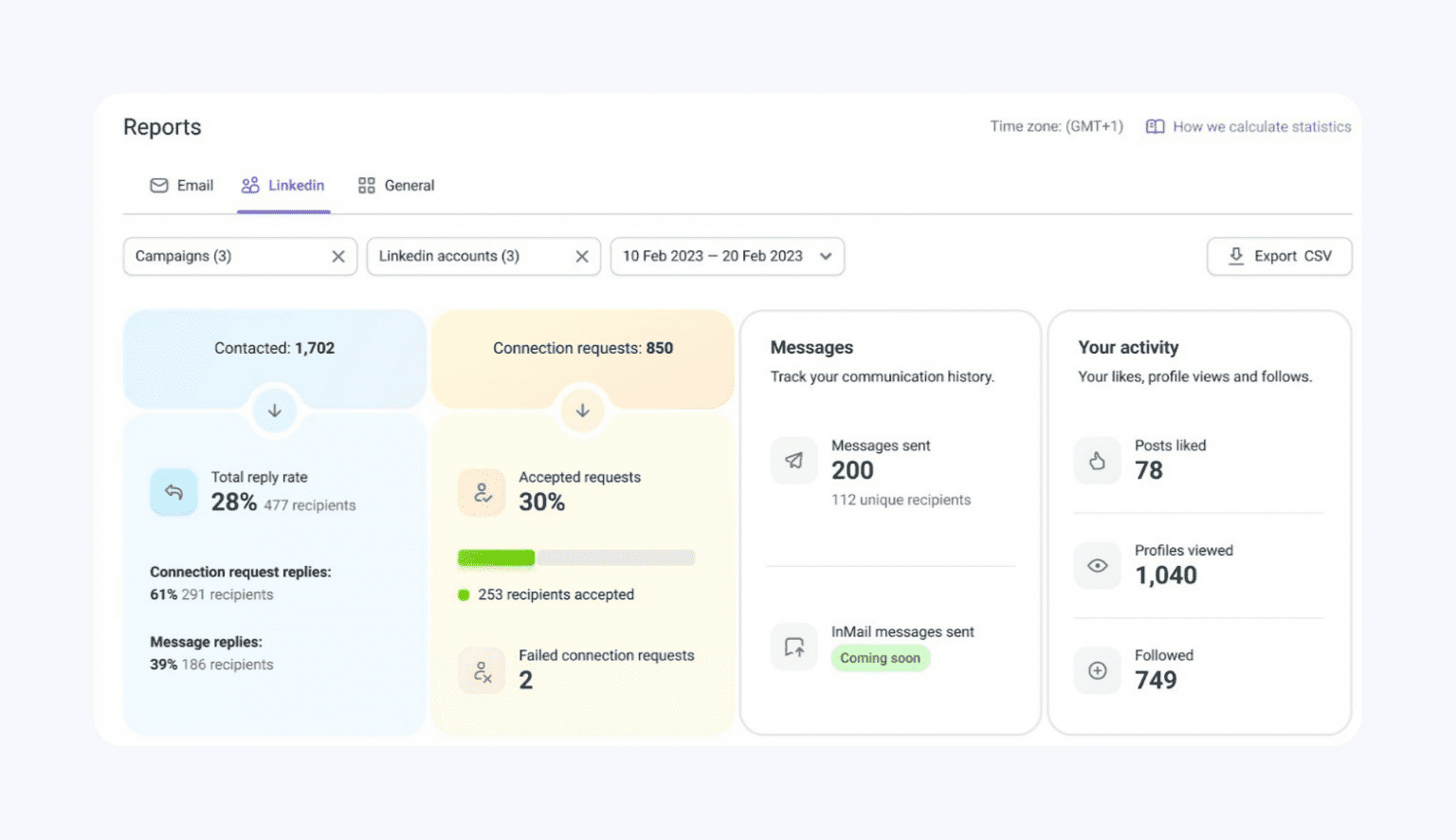 - Lançar uma campanha de prospecção alinhada ao horário de maior atividade dos seus leads, mesmo quando você estiver offline. A Snov.io automatiza o envio de mensagens e InMails.