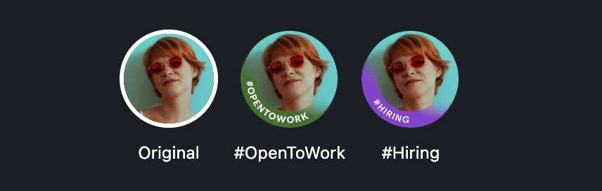 Os usuários do LinkedIn podem adicionar molduras à foto de perfil, como “Hiring” (Contratando) ou “Open to Work” (Disponível para trabalhar). Essas opções destacam seu perfil tanto nos resultados de busca quanto no feed, além de sinalizarem abertura para solicitações de conexão e mensagens diretas de potenciais empregadores ou funcionários.