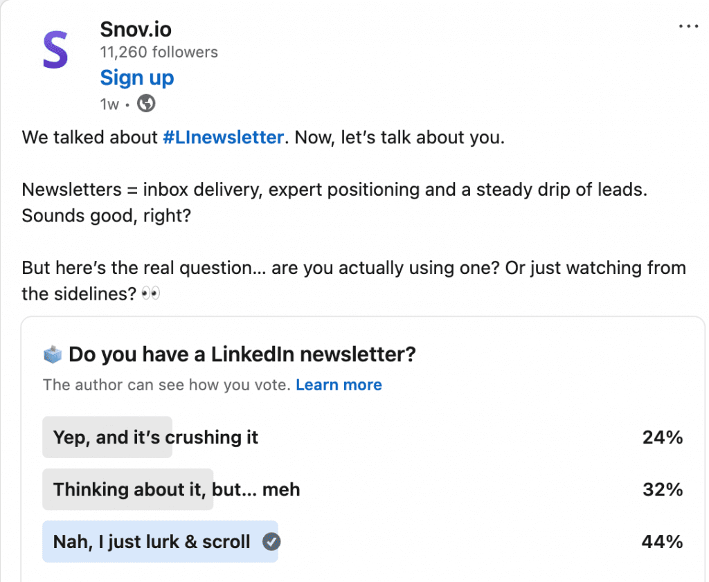 Criar enquetes é uma das funcionalidades do LinkedIn que aumenta o engajamento e ainda permite coletar feedback valioso da sua audiência. Mas atenção: só é possível adicionar quatro opções de resposta. Por isso, pense bem no que deseja descobrir com sua pesquisa antes de publicá-la.