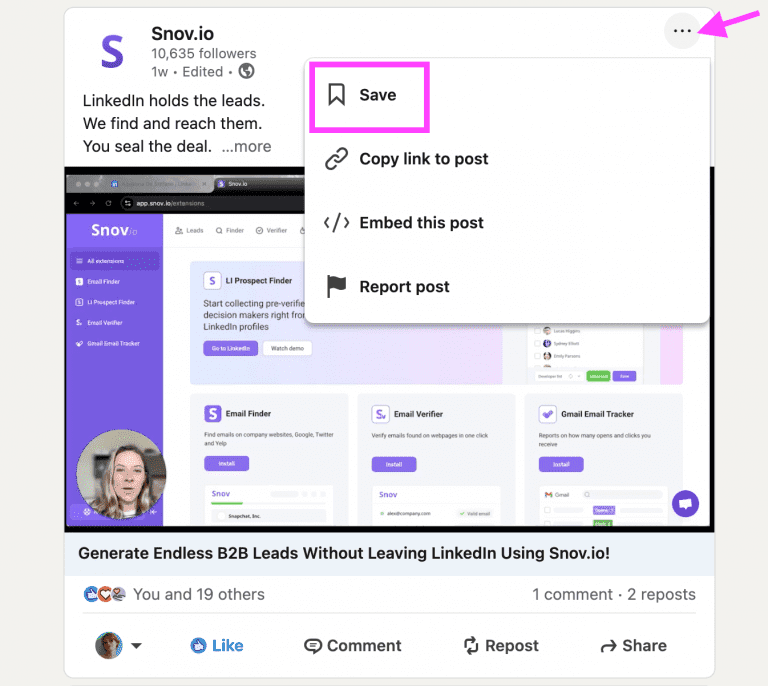 Interagir com conteúdos de outros usuários é essencial para o networking. Porém, nem sempre há tempo para ler ou comentar o que aparece no feed. Se encontrar uma publicação interessante e não puder dedicar sua atenção naquele momento, clique em “salvar publicação” no ícone de marcador no canto superior direito do post.