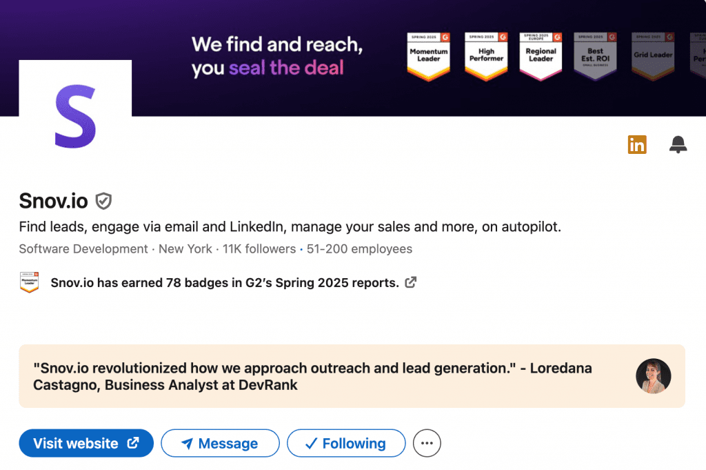 🤝 Dica pro: O InMail é excelente para abordar leads com alto potencial de conversão, mas que continuam fora da sua rede. Por exemplo, você pode enviar um InMail para um gerente de marketing de uma empresa do seu setor-alvo, mostrando como sua solução pode ajudar a gerar leads mais qualificados ou otimizar o processo de prospecção. Com a Snov.io, você também pode personalizar seus InMails para causar uma impressão ainda melhor logo no primeiro contato. |