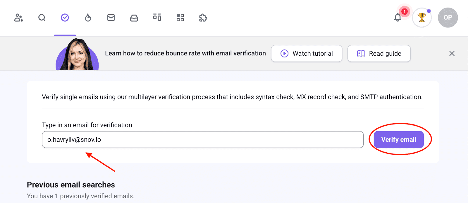 Tools like Snov.io Email Verifier can help streamline this process by allowing you to verify individual email addresses, process bulk verifications of up to 100,000 emails at once, or automatically verify emails directly within your prospect lists.