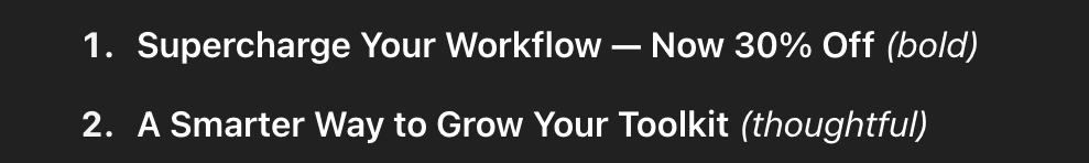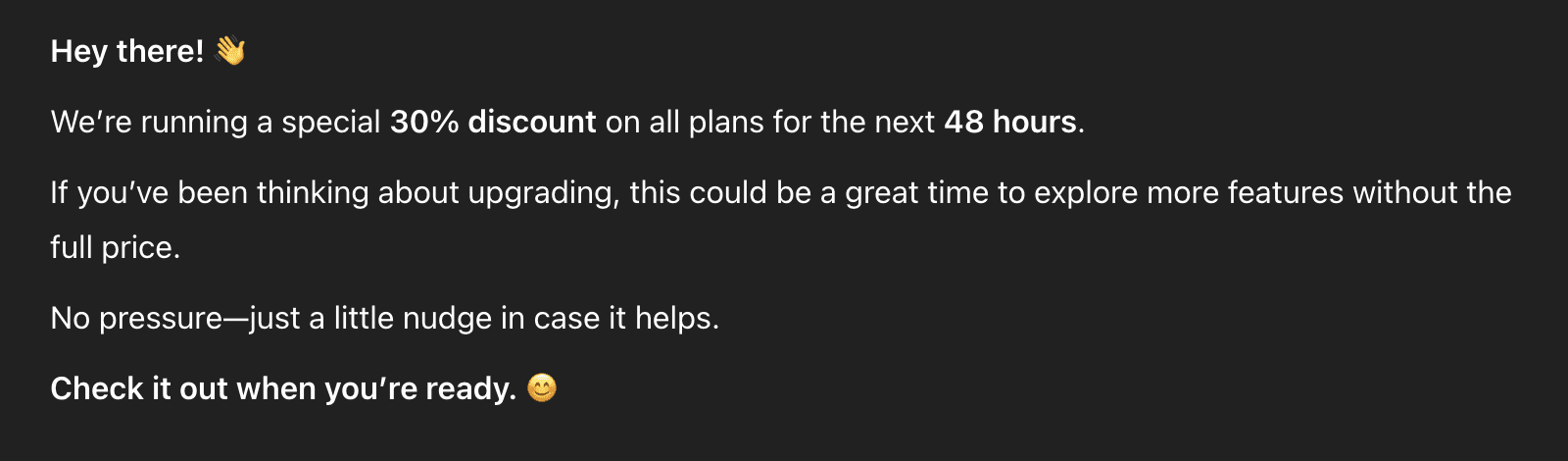 | ✅ | Create an email that offers a similar discount: 20% off the annual plan for this month’s subscribers |