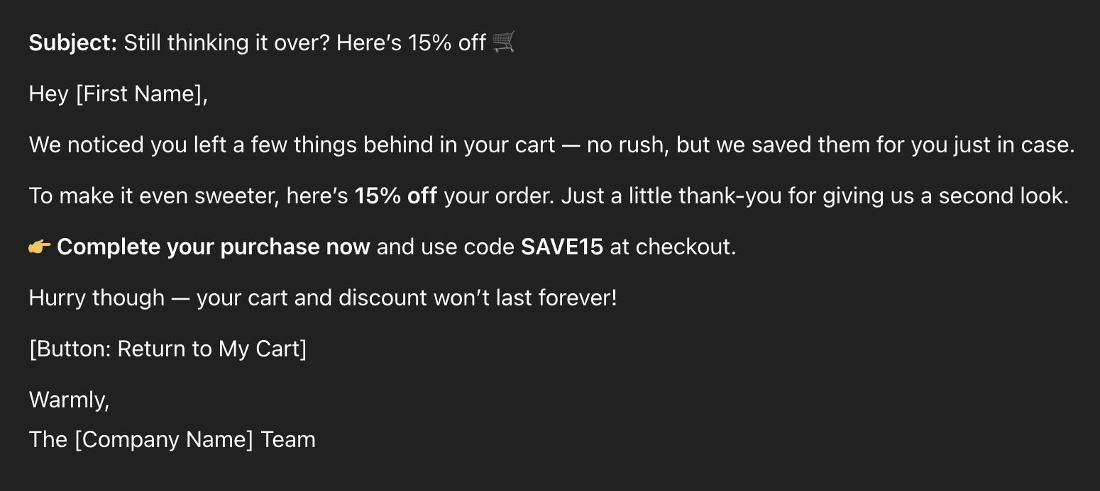 | ✅ | Write an email that would remind customers about their abandoned carts. Keep it friendly and add a 15% discount. |
