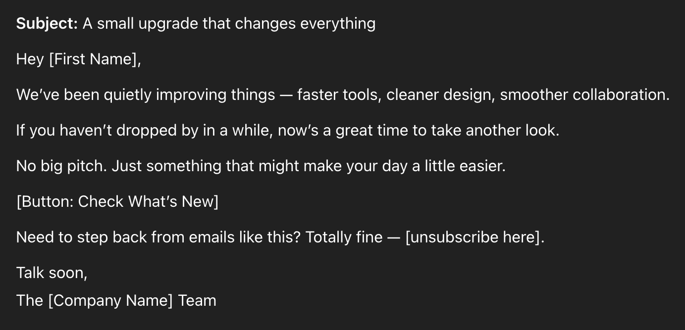 Write an email to re-engage inactive subscribers. Acknowledge the gap, use a [casual] tone, and offer a reason to rejoin.