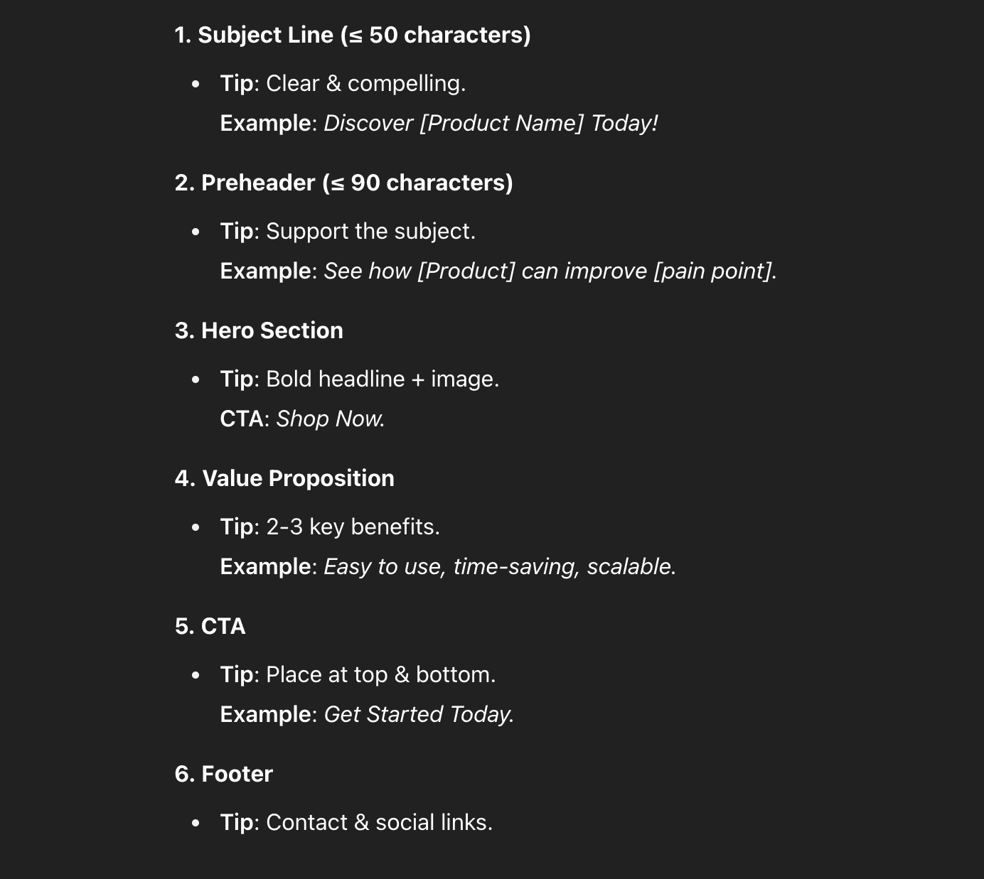 Suggest a layout for an email about a new product launch. Add best practices for subject line length, CTA placement, and mobile-friendly design.