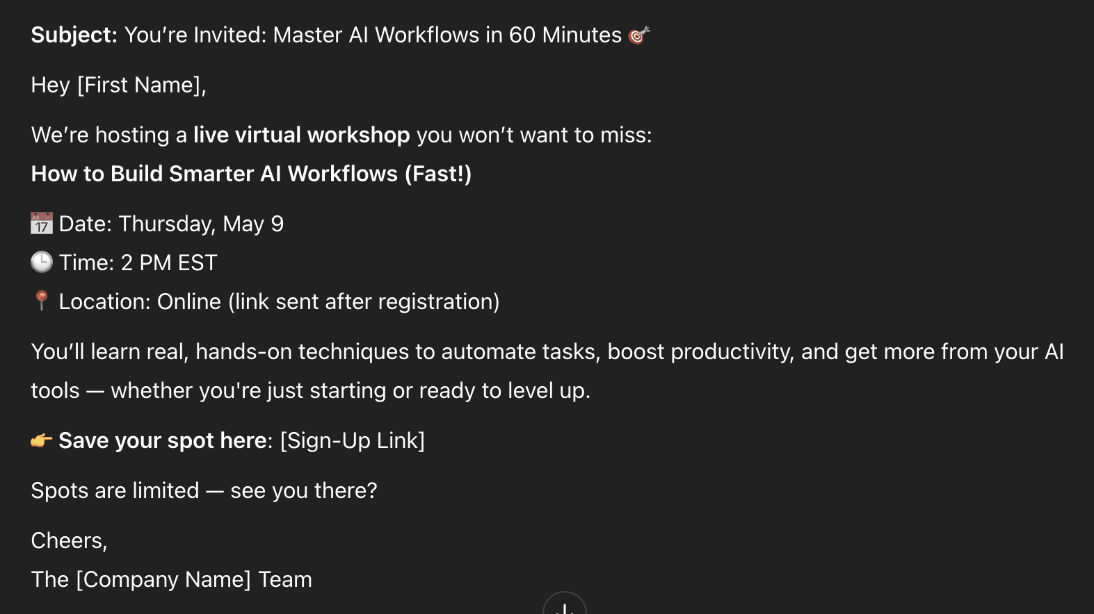 | ❌ | Write an email that invites potential customers to the [topic] webinar that takes place on [date]. |