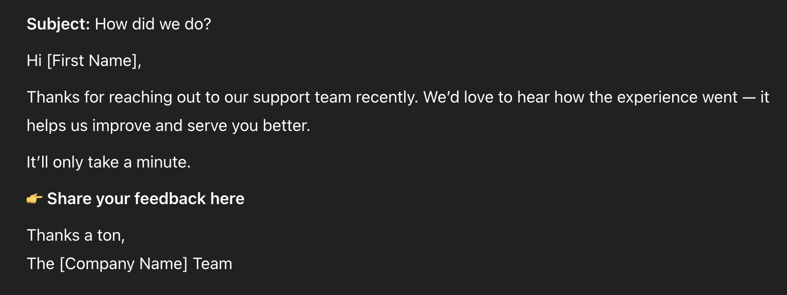 | ❌ | Write a customer feedback request email that isn’t too long and doesn’t sound boring. |