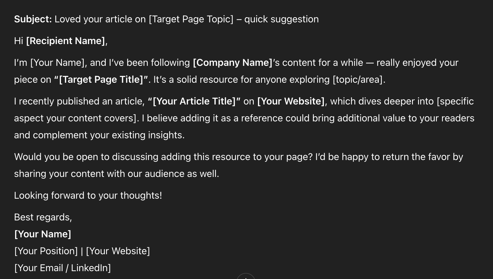 Act as an experienced SEO outreach specialist. Write a personalized first outreach email to [Recipient Name], [Job Title] at [Company Name]. The goal is to build a relationship and request a backlink to our article, “[Your Article Title],” published on [Your Website]. Mention how their article “[Target Page Title]” aligns with our content and explain why adding our link would bring value to their readers. Use a friendly, professional tone, keep it under 150 words, and include a clear call-to-action to discuss the addition. Provide placeholders for personalization.