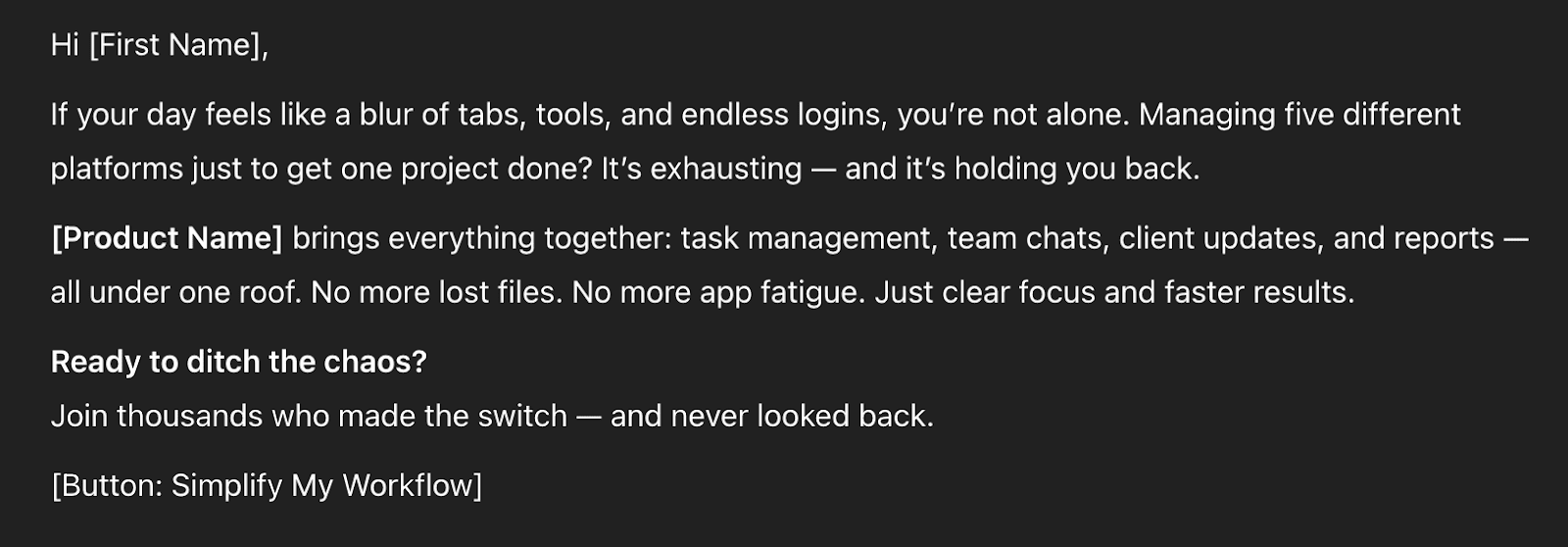 Generic ChatGPT prompts produce generic output. After all, AI email writing tools can’t read your mind to deliver exactly what you want.