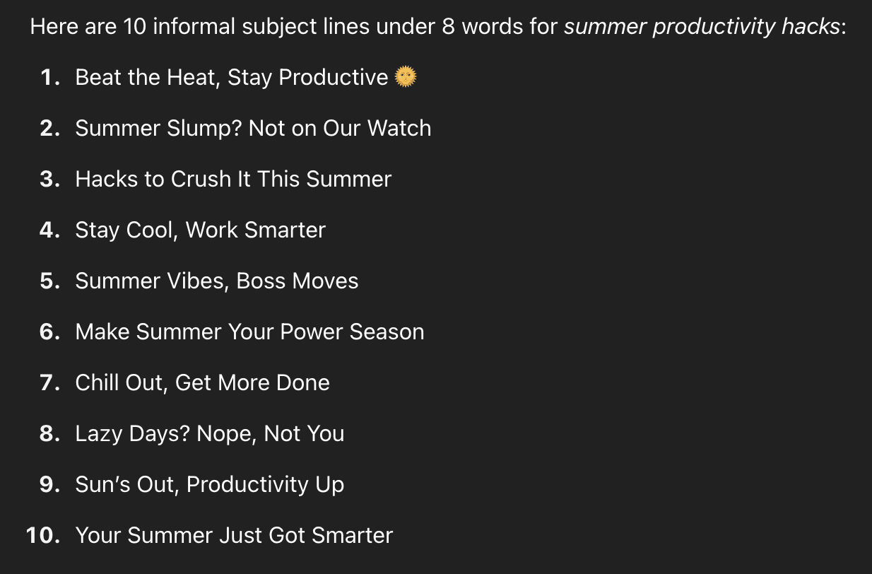 Generate 10 subject line variations for an email about [summer productivity hacks]. Make it engaging and aligned with a [formal] tone, keep it under [8] words.