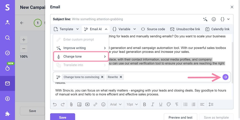 You know which tone your prospects prefer best; with this AI personalized email builder, you can adjust your campaigns accordingly. Simply ask the tool to change the tone from informal to more professional, or vice versa, applying it either to the entire copy or just to a specific part.
