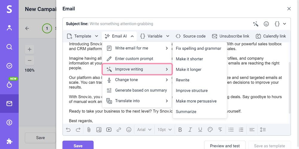 With Snov.io AI email generator, you can also enhance the existing draft and customize it to your needs. The tool will correct mistakes, refine its structure, or rewrite the copy for a more suitable alternative.