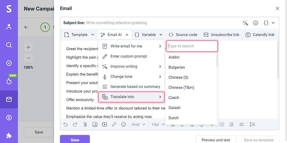 Just like ChatGPT, Snov.io AI email generator is a multilingual tool. It allows crafting and translating emails into 36 languages, so you could connect with prospects worldwide.