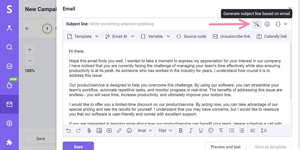 With a click on a magic wand, you can head your email with a catchy and relevant subject line based on its body content, style, and structure. The tool will generate a converting subject, increasing your open rate.