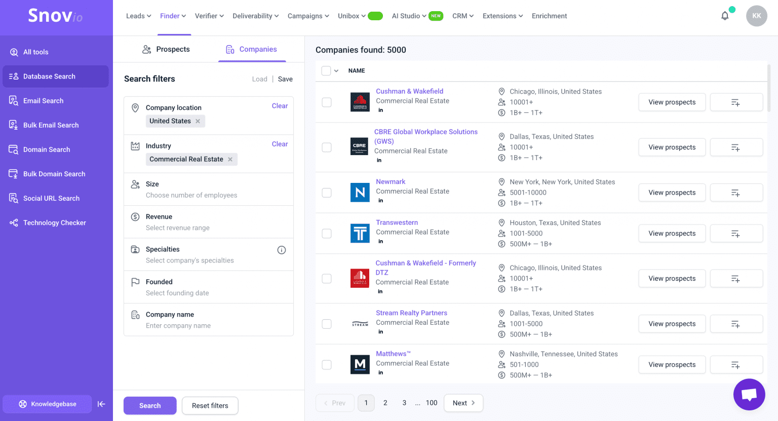 La base de datos de Snov.io contiene más de 50 millones de contactos de empresas y filtros extensos para facilitar tu prospección.