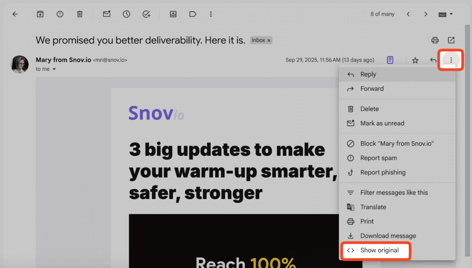 Para examinar la información clave, haz clic en los tres puntos en la esquina superior derecha del mensaje y elige “Mostrar original”: