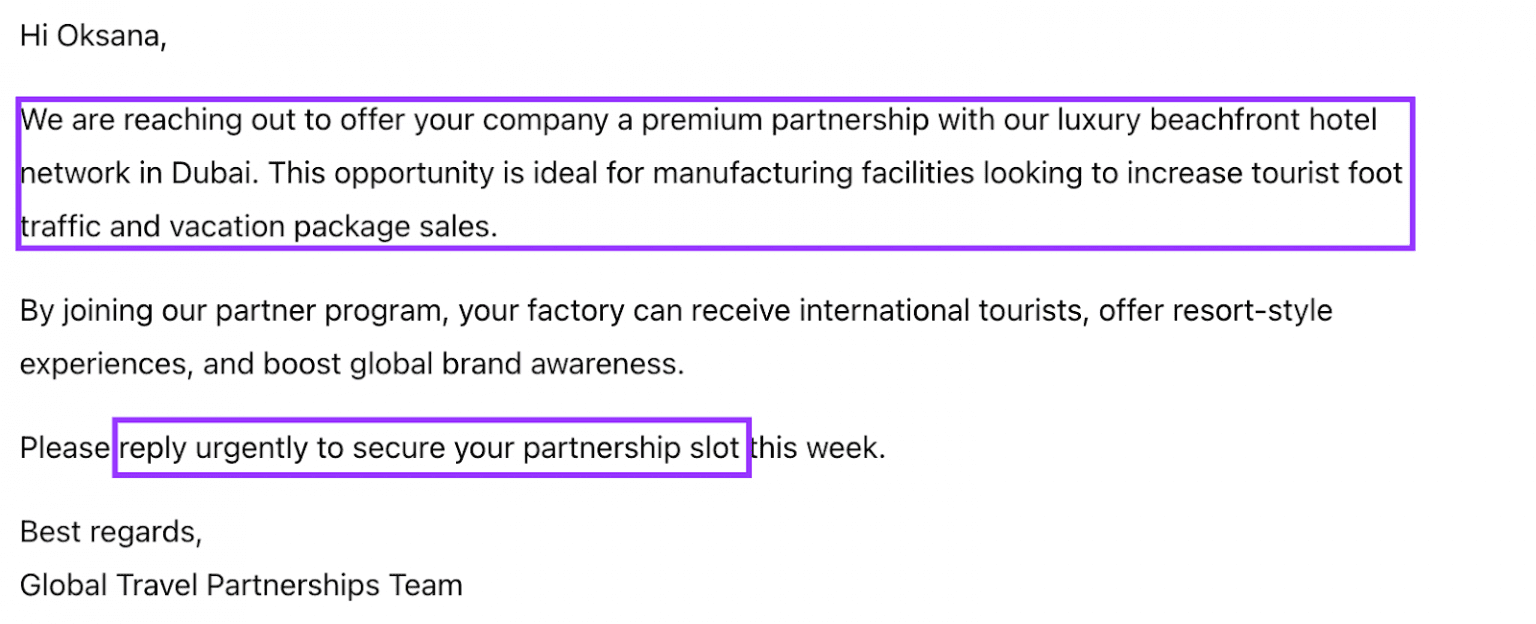 Las empresas reales generalmente explican por qué se están comunicando contigo, ofrecen valor que claramente coincide con tus responsabilidades y usan un contexto específico y realista.