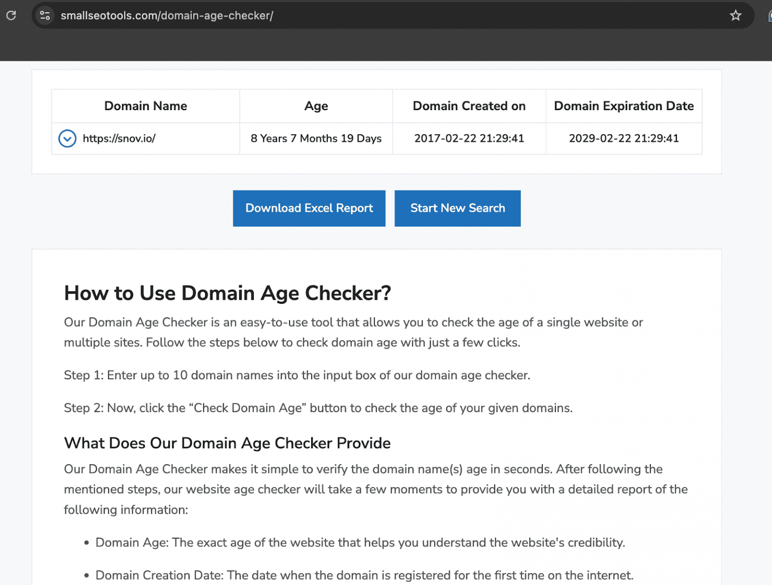 La antigüedad del dominio también puede ayudarte a detectar correos electrónicos falsos. Los estafadores frecuentemente usan dominios recién creados para sus esquemas, mientras que las empresas reales generalmente se quedan con dominios establecidos. Los verificadores de dominio gratuitos, como SmallSEOTools, te permiten ver cuándo se registró un dominio por primera vez.
