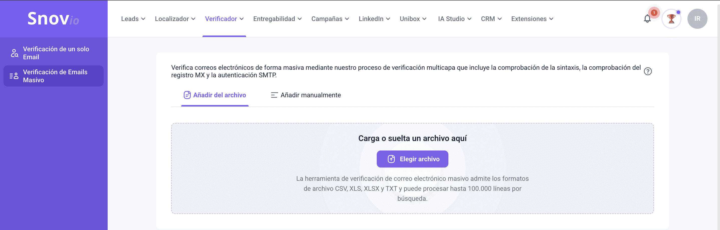 Verificación de correos en masa de Snov.io