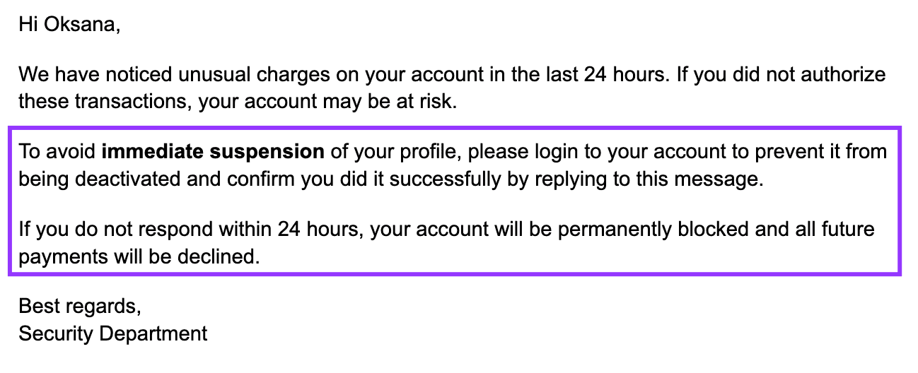 Sin embargo, ten en cuenta que ahora las herramientas de escritura con IA, como ChatGPT, ayudan a los estafadores que no hablan inglés a crear mensajes pulidos y sin errores que se asemejan mucho a los de empresas legítimas. Esto hace que sea más difícil detectar contenido de correo electrónico falso solo por la calidad de la redacción.
