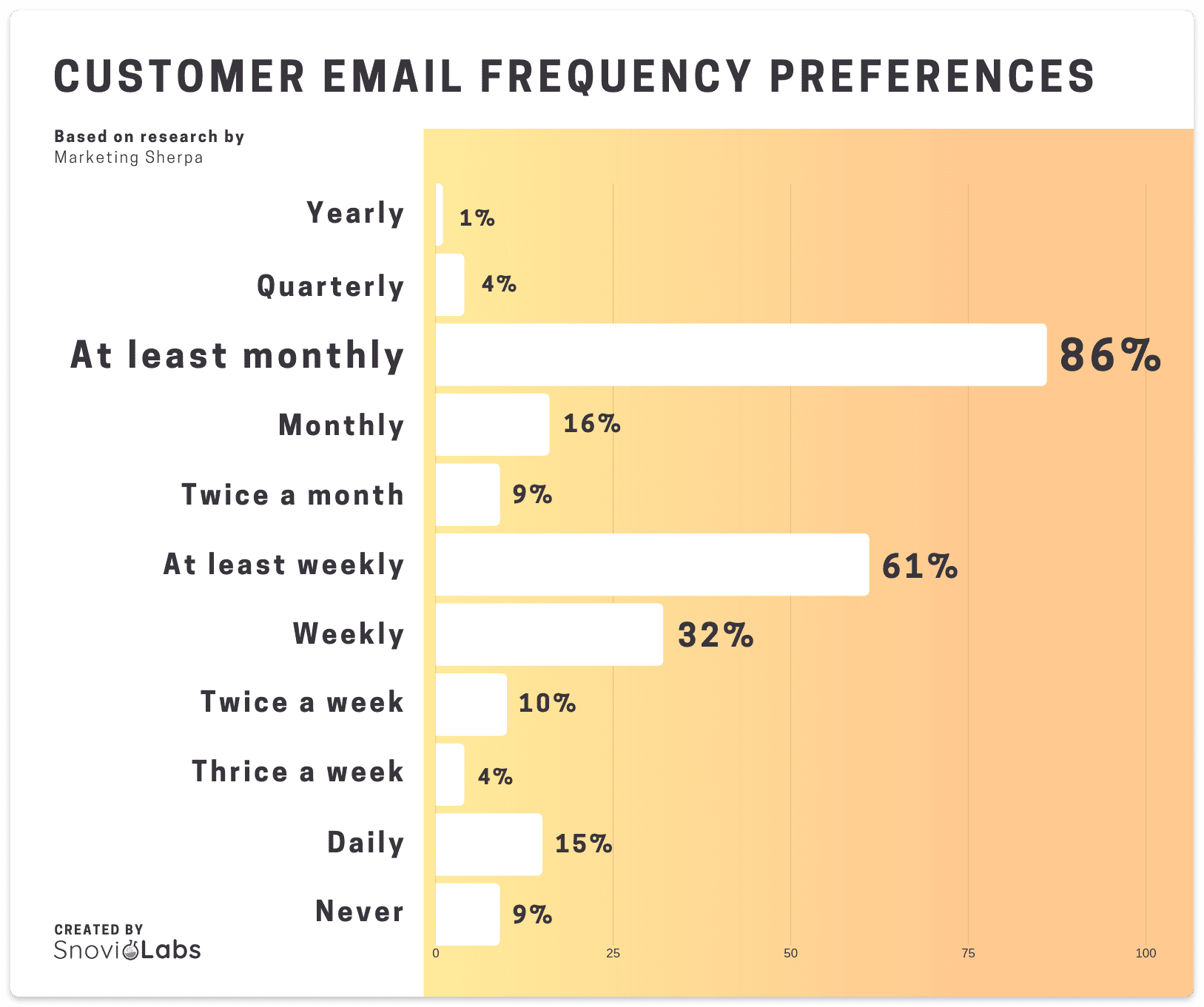 El hecho de que tus suscriptores quieran menos correos no significa que no quieran saber de ti en absoluto. Como ya mencionamos, darles a tus suscriptores la posibilidad de elegir su propia frecuencia puede ser una gran estrategia. Para descubrir exactamente cuál es la frecuencia más preferida, MarketingSherpa investigó las preferencias y opiniones de los suscriptores sobre diferentes frecuencias de correo electrónico.