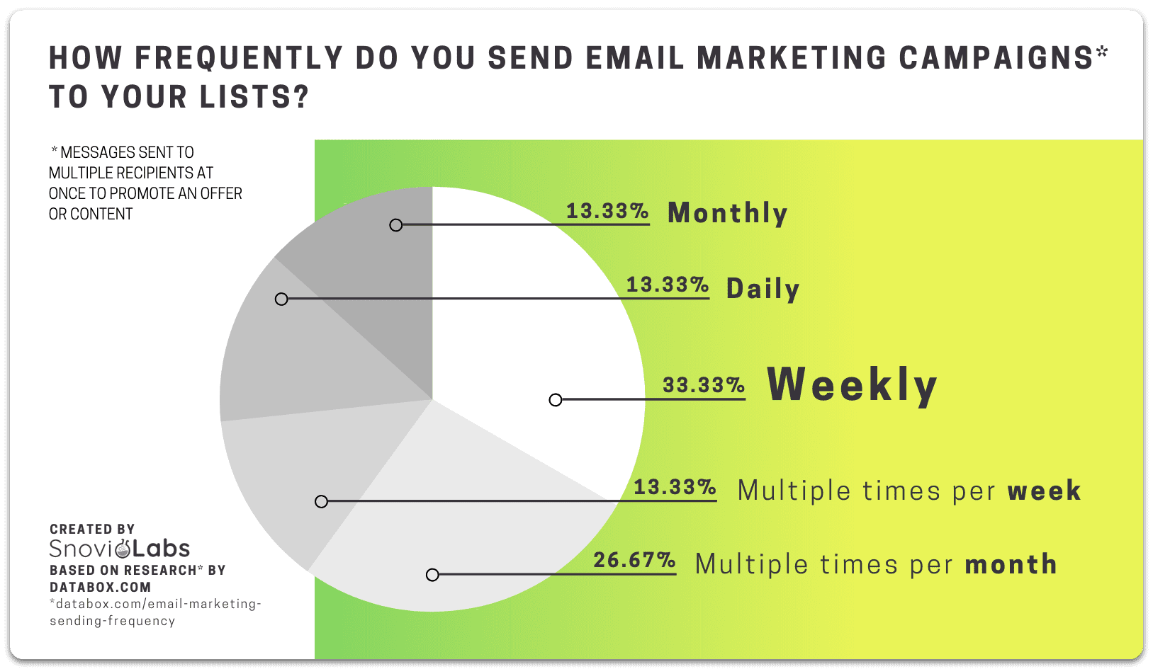 Según Databox, el 33,3% de los profesionales envían campañas de correo electrónico semanalmente, el 26,67% varias veces al mes, y el 13,33% cada uno: varias veces por semana, diariamente y mensualmente.