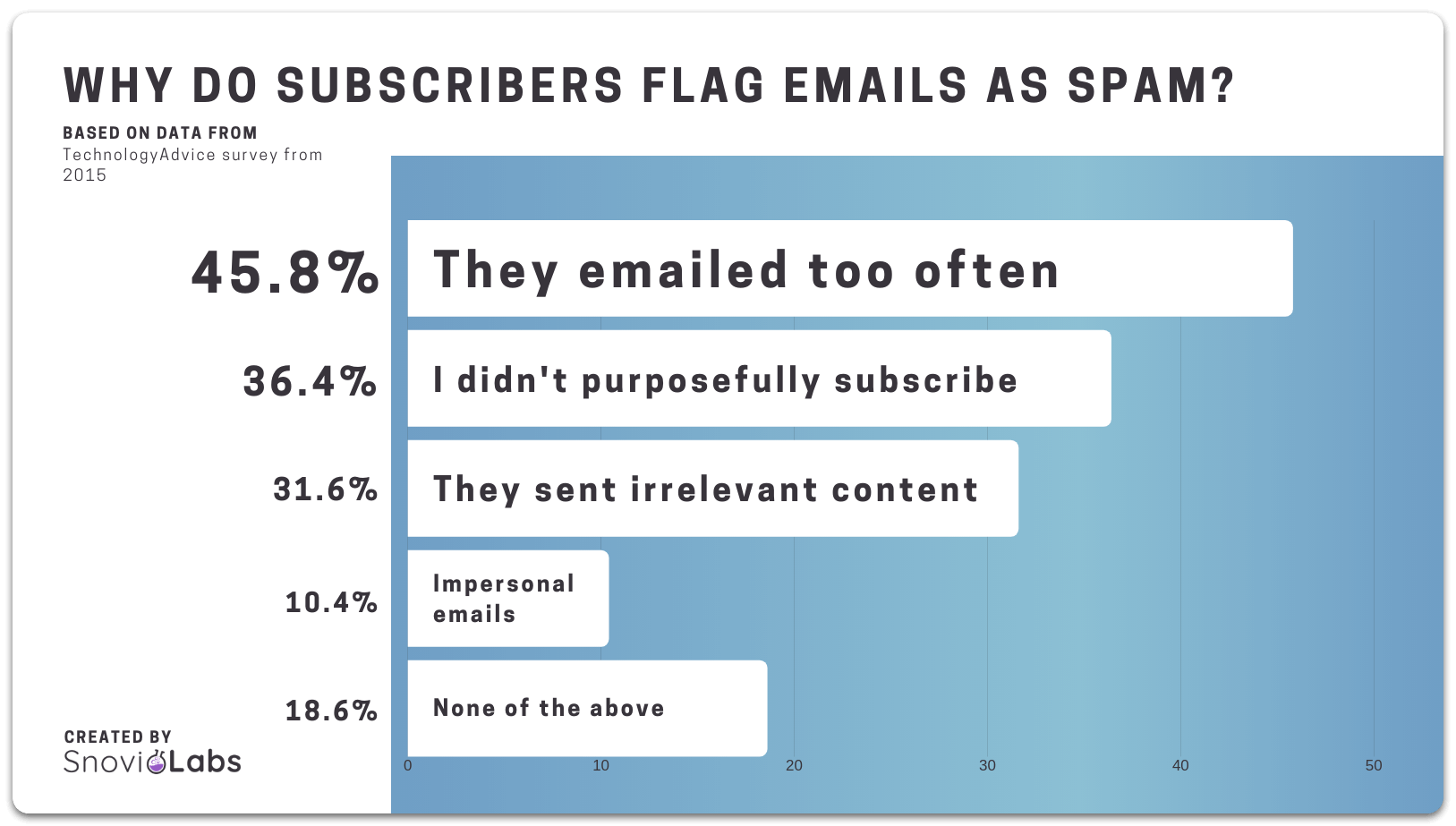 Según una encuesta de TechnologyAdvice, casi la mitad de los suscriptores —el 45,8%— marcará los correos como spam si los recibe con demasiada frecuencia. Otras razones para enviar correos a Spam son: no se han suscrito intencionalmente a esos correos (36,4%), contenido irrelevante (31,6%), y falta de un enfoque personal (10,4%).