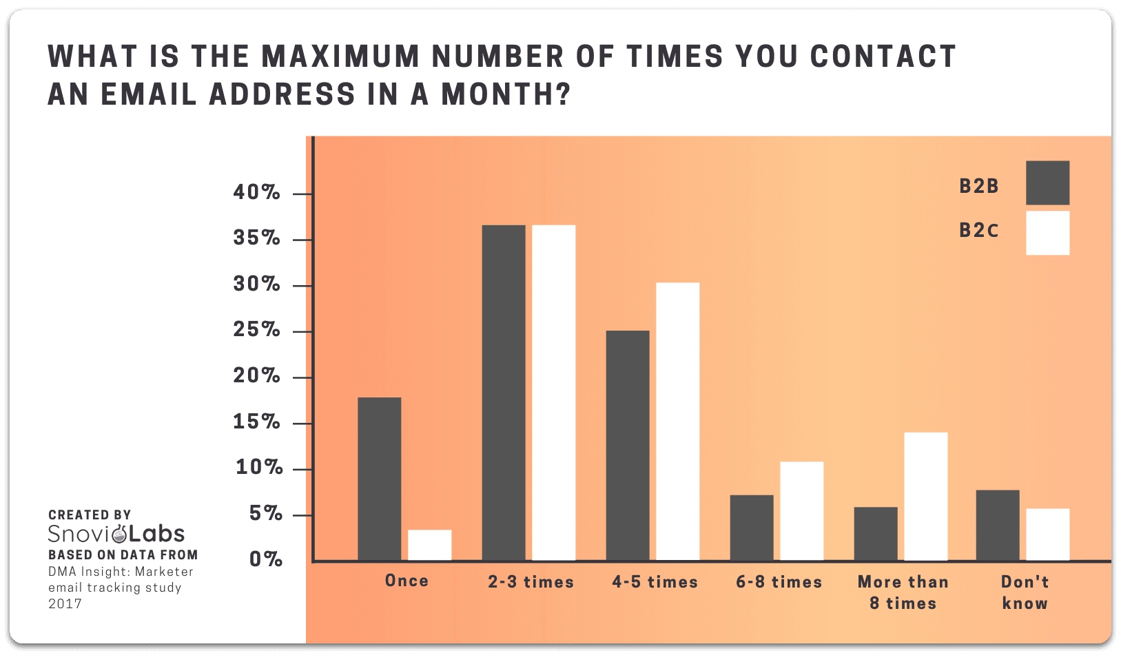 Según el estudio de seguimiento de correos electrónicos de marketers de DMA Insight, dos de las tres respuestas más populares para los marketers B2B y B2C fueron las mismas. Tanto los especialistas B2B como B2C respondieron que contactan 2–3 veces al mes (37% cada uno) y 4–5 veces al mes (25% en B2B y 30% en B2C) como la frecuencia máxima de correo electrónico que utilizan.