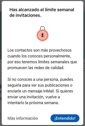 Si tienes muchas invitaciones pendientes, eso puede señalar que tus solicitudes de conexión no son bienvenidas en LinkedIn. Por lo tanto, podrías ser un spammer y no se te debería permitir enviar más invitaciones. ¿Ves la lógica?